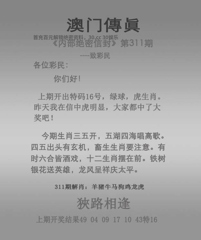 | 传真315期 今期生肖一八开,穿金戴银戴兰花。 今期特尾二三七,三八三九还要防。 风流才子俏佳人,玄机道破点三二。 买了一六出二九,森林之中它为王。 专横跋扈 解:今期穿金戴银戴兰花,解吉美生肖兔龙蛇马羊鸡,森林之中它为王,解野兽生肖蛇虎兔龙鼠猴。 无敌九肖:龙虎兔狗牛马猴羊猪 |